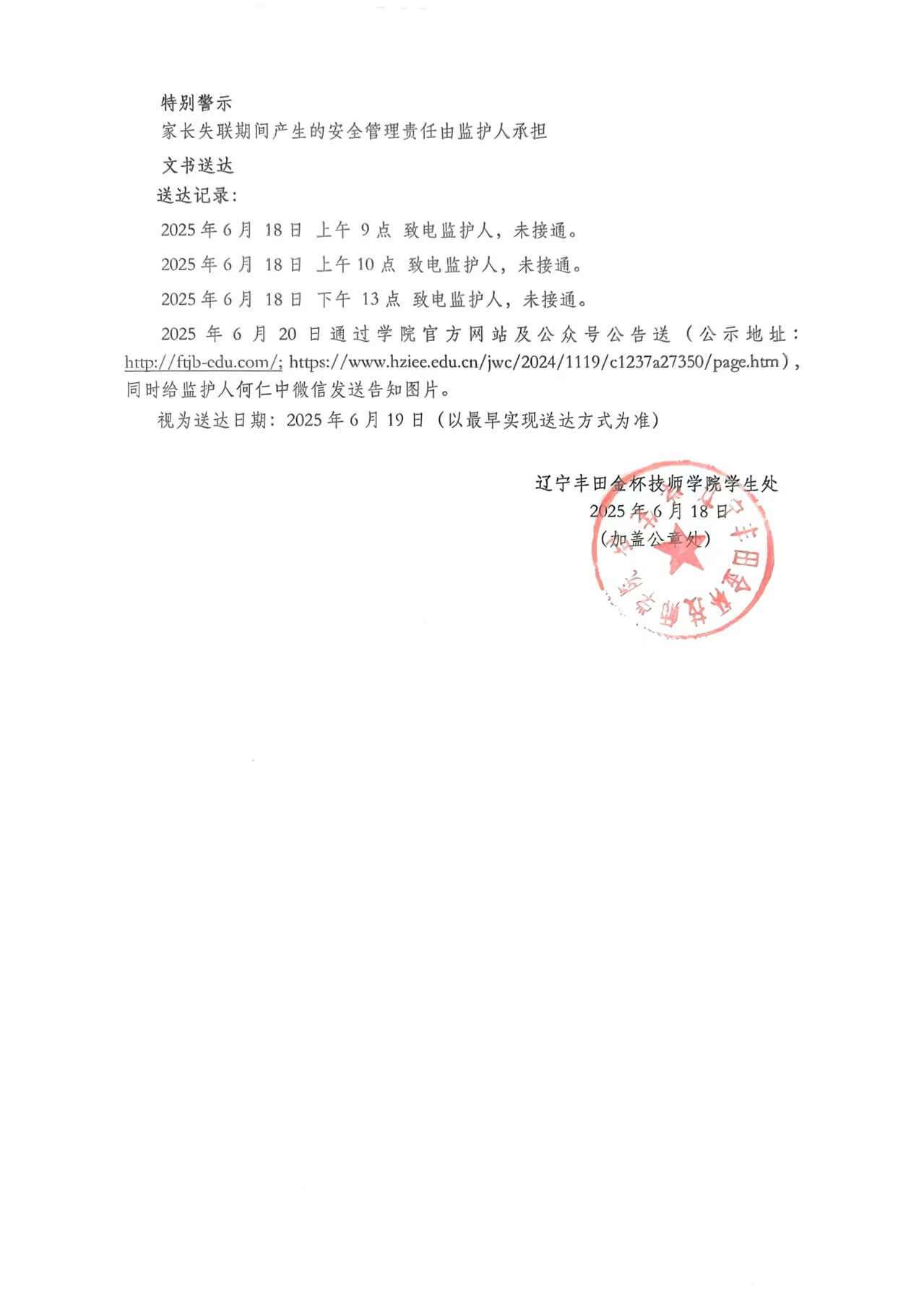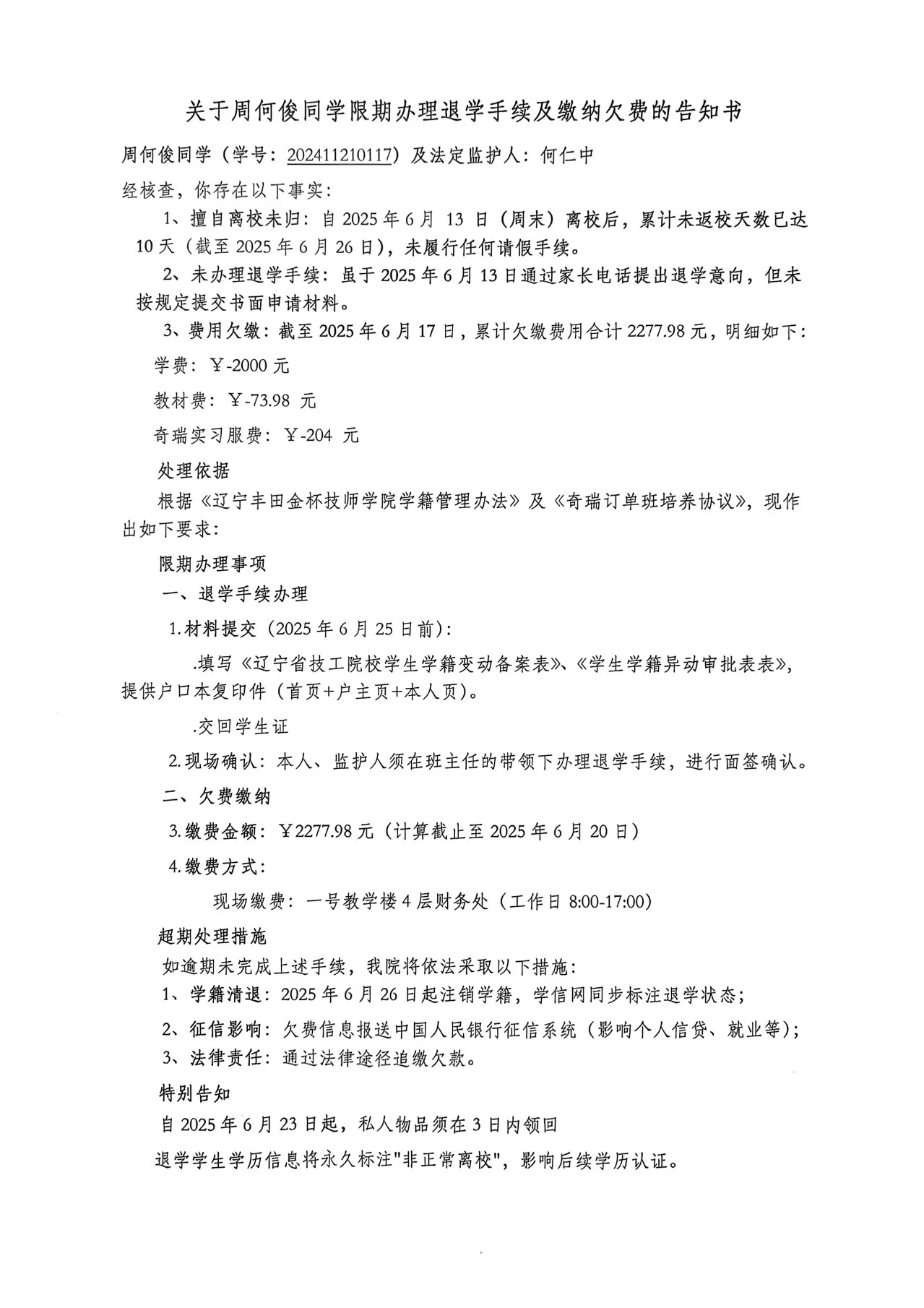 关于周何俊同学限期办理退学手续及缴纳欠费的告知书